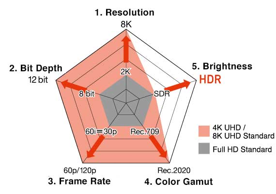 要了解HDR的重要性要从视频质量的五要素说起, 这五个要素共同决定电视能呈现的内容和现实情况(或导演想要的)的程度,从SDR到HDR这五个要素都大大提升: